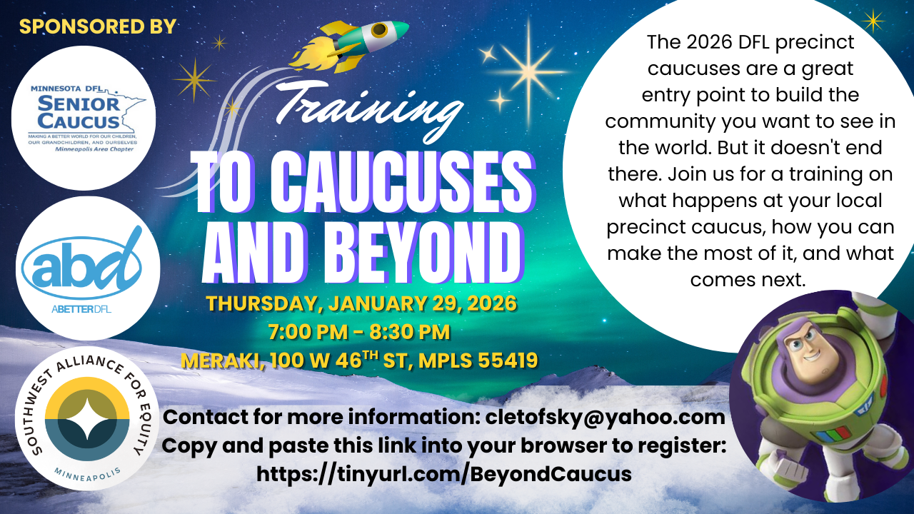 Training: To Caucuses and Beyond, January 29, 7 pm to 8:30 pm, at Meraki, 100 W. 46th St, Mpls 55419. You can register at https://tinyurl.com/BeyondCaucus