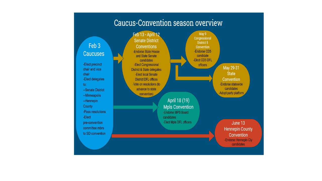 At this time in our beloved cities, we are called on to exercise our democratic muscles. Over the next few months, DFLers across the state will be gathering to 1) endorse candidates for office; 2) consider resolutions that will create the DFL’s official platform; and 3) elect party officers at every level. And it all starts with precinct caucuses on Tuesday, February 3rd. Doors open at 6:30 pm, and caucuses start at 7.